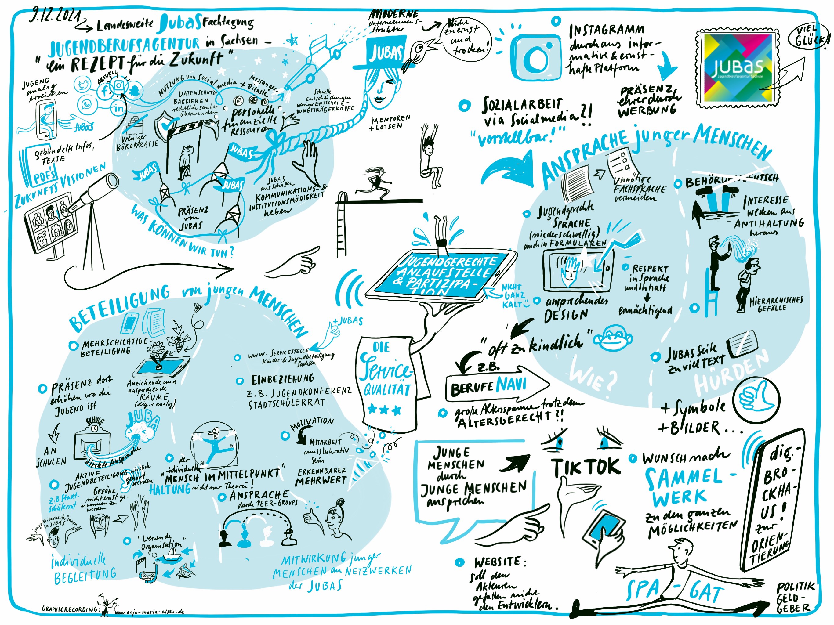 Am 9. Dezember 2021 fand die landesweite JubaS-Fachtagung „Jugendberufsagentur in Sachsen – Ein Rezept für die Zukunft“ mit rund 130 Akteure aus Jugendberufsagenturen, Verwaltung, Politik und der Fachöffentlichkeit statt. Sie markierte beides: Als Abschluss der ersten Runde des Förderprogramms „JubaS – Jugendberufsagentur Sachsen“ bot sie Gelegenheit, Zwischenbilanz zu ziehen. Als Auftakt zur Fortsetzung des Förderprogramms ermöglichte sie einen Ausblick auf die Zukunft der Jugendberufsagenturen im Freistaat. Die Fachtagung wurde gemeinsam mit dem Sächsischen Staatsministerium für Wirtschaft, Arbeit und Verkehr durchgeführt.
